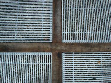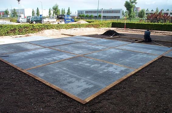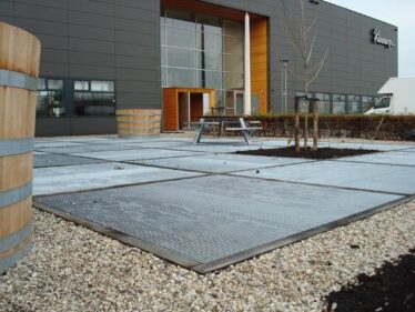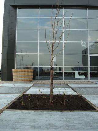 Wat in het oog springt bij deze moderne bedrijfstuin is de vormgeving, het materiaalgebruik en de strakke afwerking. Met eikenhouten balken is een regelmatig grit geconstrueerd, omgeven door grind. De balken hebben profielen, waarin gegalvaniseerde tri-bar roosters zijn geplaatst. De zwevende roosters dienen als terras. De lijnvoering van het grit rijmt qua ritme met de belijning van het moderne bedrijfspand. Op de roosters heeft Groenpartners vier manshoge kuipen van Robinia hout geplaatst, gevuld met water en waterplanten, die dienen als sierelement. Rondom dit terras is het terrein verder verfraaid met beplanting en bomen.