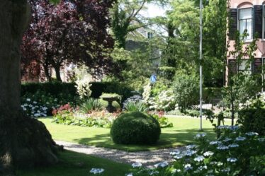 Niet alleen de overtuin maar ook de voortuin is rijkelijk voorzien van stinse bollen. Het snoeienen van de halfronde buxusbollen is elk half jaar weer een nauwkeurige klus. De Yucca is een mooi voorbeeld van een plant die past bij de stijl van het huis.