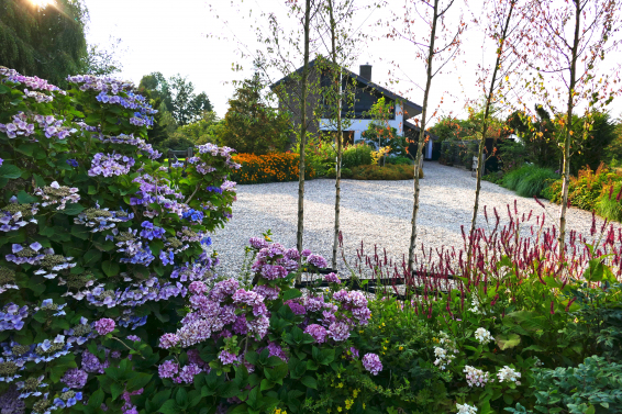 In het kleinschalige veenlandschap van Kortenhoef ligt een groen paradijsje waar je helemaal tot rust kunt komen. Om vrienden en familie in grote getalen te kunnen ontvangen is er aan de voorkant van het terrein een groot grindplein aangelegd dat begrensd wordt door kleurige borders waar het hele jaar door boeketten van worden geplukt. Niet alleen bloemen, maar ook groenten kunnen uit deze tuin worden geoogst dankzij de luwgelegen moestuin. De geleide morel groeit en bloeit goed op de noordelijk gelegen zwarte schutting. Deze plant houdt zijn vorm door het traditionele eikenhouten trelliswerk. Geheel in stijl met de bungalow uit de jaren ’70 is er gekozen voor leisteen om het terras mee aan te leggen. De rest van de verhardingen bestaat uit traditioneel meerkleurig grind.