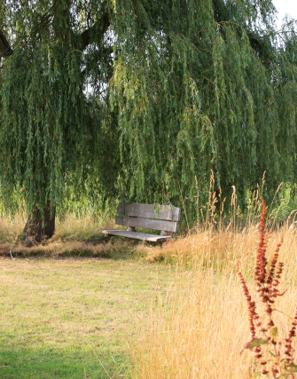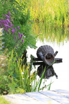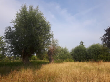 Het achterliggende grasland is een vochtige weide die grenst aan het natuurlijke veengebied, dat alleen toegankelijk is met een kano. Een natuurlijk element waar de bewoners dankbaar gebruik van maken. Zowel het speciaal gebouwde botenhuis annex schuur als de kas zijn ontworpen om op te gaan in de tuin, zowel qua materiaalgebruik als de cultuurhistorische kleur. Schuren in gebied waren traditioneel zwart geteerd. Ook worden het gras en bloeiende kruiden van het weiland hoogzomer gemaaid en gebruikt als natuurlijk paardenvoer. Gedurende de groei van het lange gras worden er systematisch paden gemaaid zodat het romantische zitplekje onder de treurwilg bereikbaar blijft. In de vroege ochtend en de late avond zijn er vele vogels en andere wilde dieren te spotten.