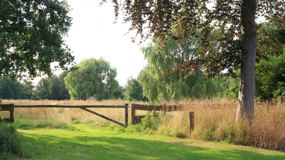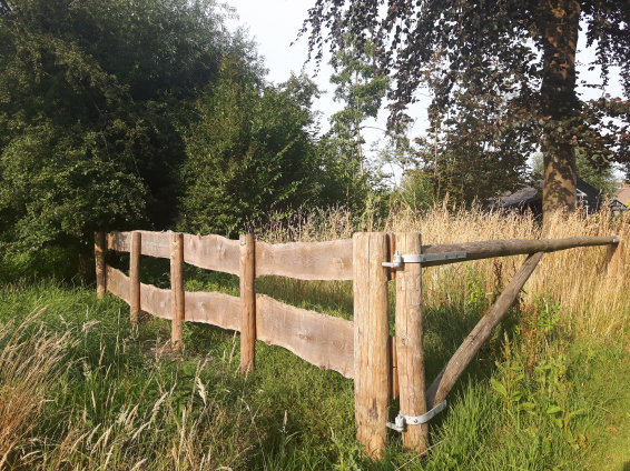 Het achterliggende grasland is een vochtige weide die grenst aan het natuurlijke veengebied, dat alleen toegankelijk is met een kano. Een natuurlijk element waar de bewoners dankbaar gebruik van maken. Zowel het speciaal gebouwde botenhuis annex schuur als de kas zijn ontworpen om op te gaan in de tuin, zowel qua materiaalgebruik als de cultuurhistorische kleur. Schuren in gebied waren traditioneel zwart geteerd. Ook worden het gras en bloeiende kruiden van het weiland hoogzomer gemaaid en gebruikt als natuurlijk paardenvoer. Gedurende de groei van het lange gras worden er systematisch paden gemaaid zodat het romantische zitplekje onder de treurwilg bereikbaar blijft. In de vroege ochtend en de late avond zijn er vele vogels en andere wilde dieren te spotten.