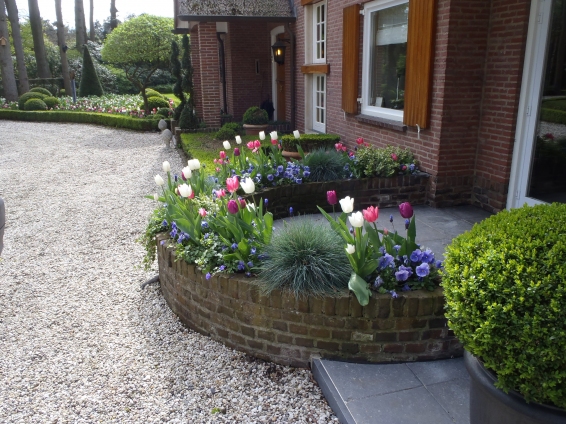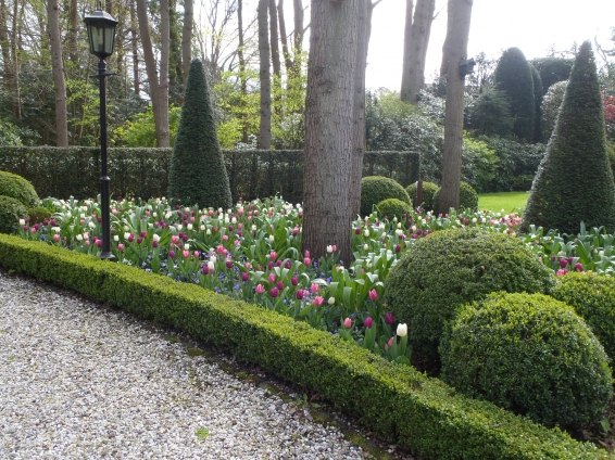 De grote eikenbomen langs de grasvelden geven de tuin een beschut gevoel. Op open plekken verschijnt er in het voorjaar een grote diversiteit aan bloembollen. Vanaf februari tot juni bloeien de bloembollen.